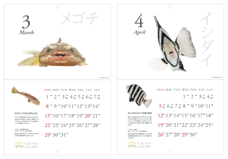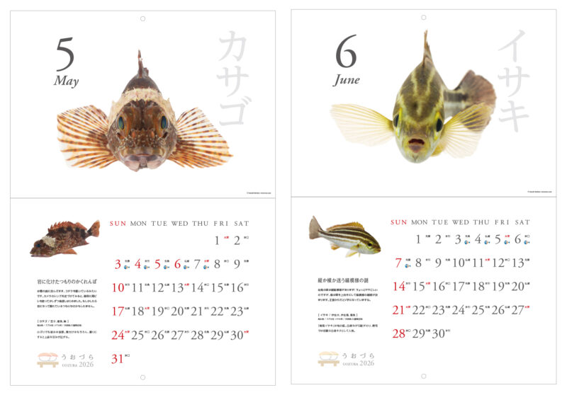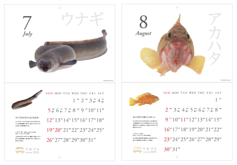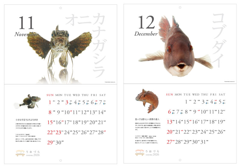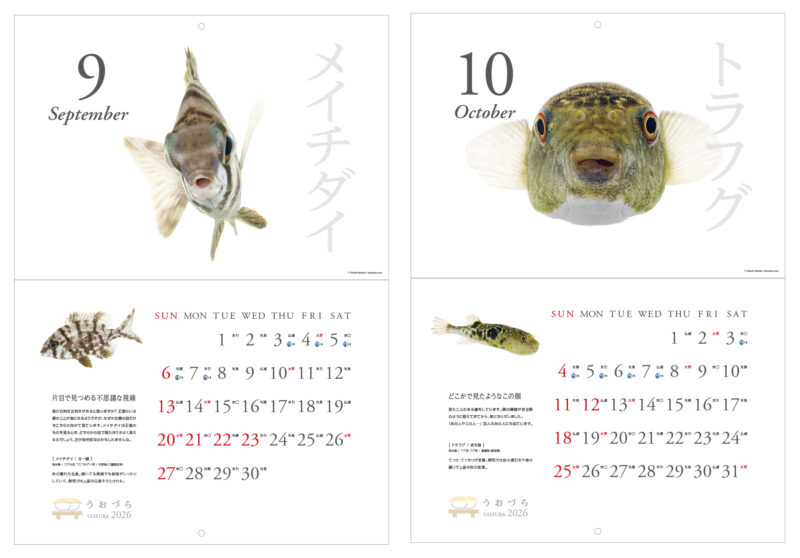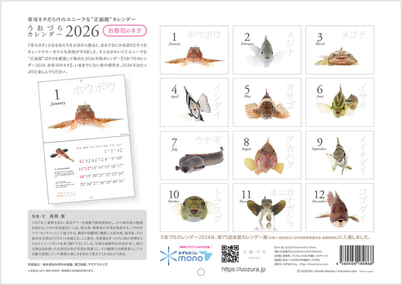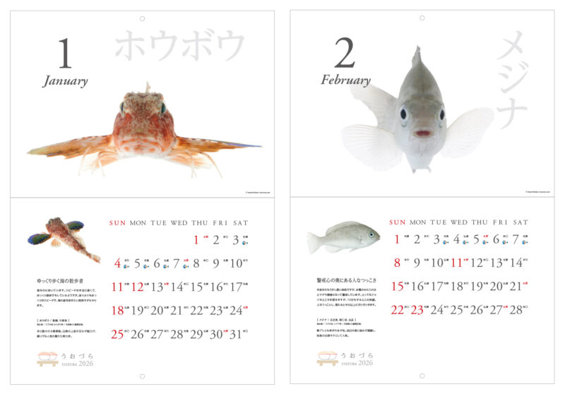 「寿司ネタ」となる魚たちを正面から撮ると、まるでなにかを語りたそうなキュートでユーモラスな表情が写りました。そんなかわいくてユニークな“正面顔”ばかりを厳選して集めた2026年版カレンダー【うおづらカレンダー2026 お寿司のネタ】。
